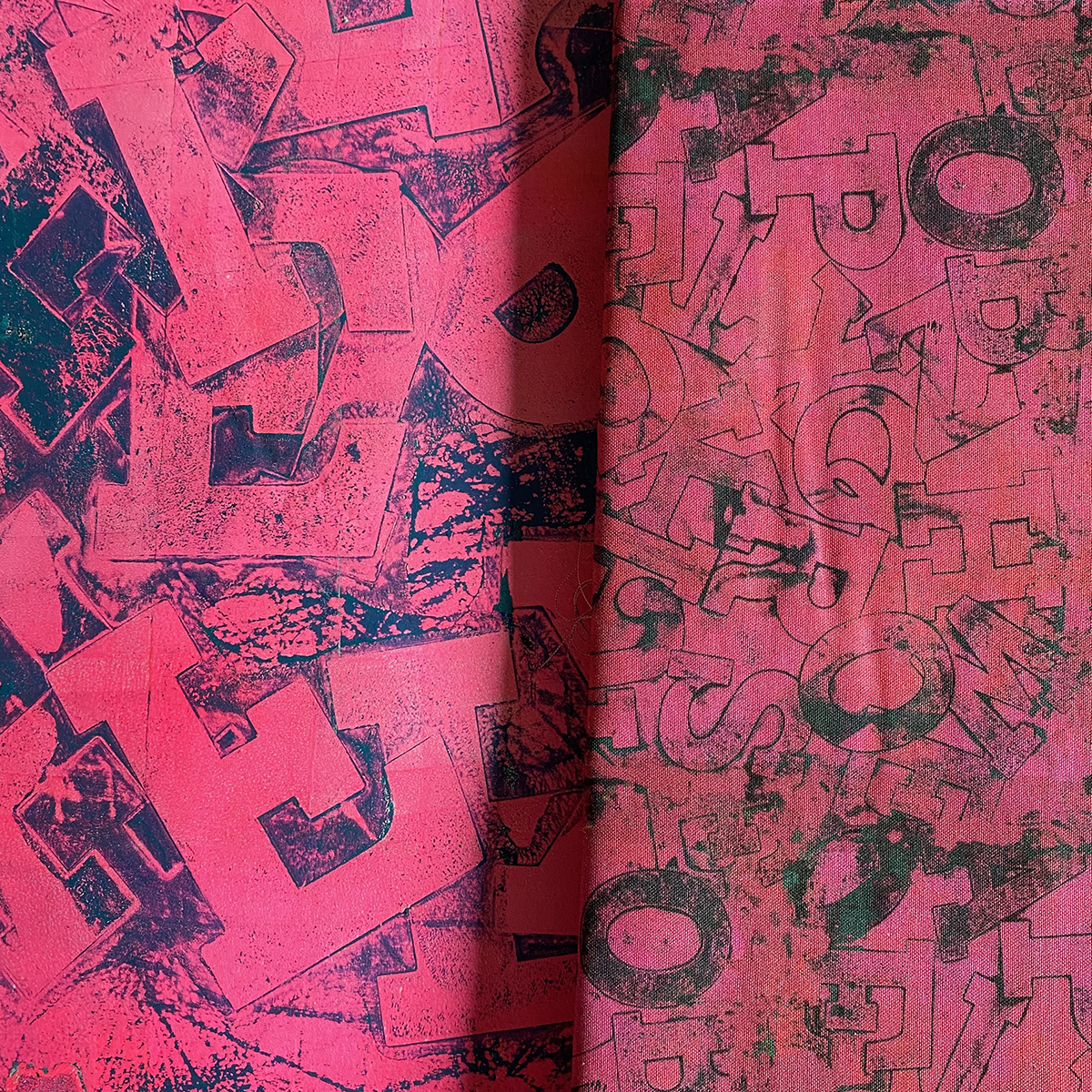 Working on RAVEL was an amazing opportunity to continue my visual exploration into shapes. For this collection, I focused on the modern Roman alphabet (aka the 26 letterforms from A—Z ) as the primary shapes I wanted to work with. RAVEL became a collection of prints about these shapes coming together and falling apart. While creating, my main questions circled around a.) How can I break letters apart into new, interesting forms and also b.) Is it possible to obscure these already imbued symbols so much that they ‘lose’ their meaning? The letterforms in RAVEL run the gamut from being clear & legible to fractured, to finally some forms completely disintegrating into their environments.