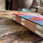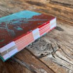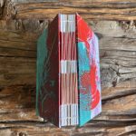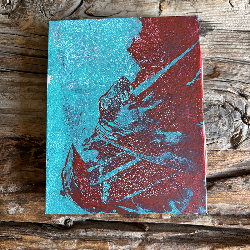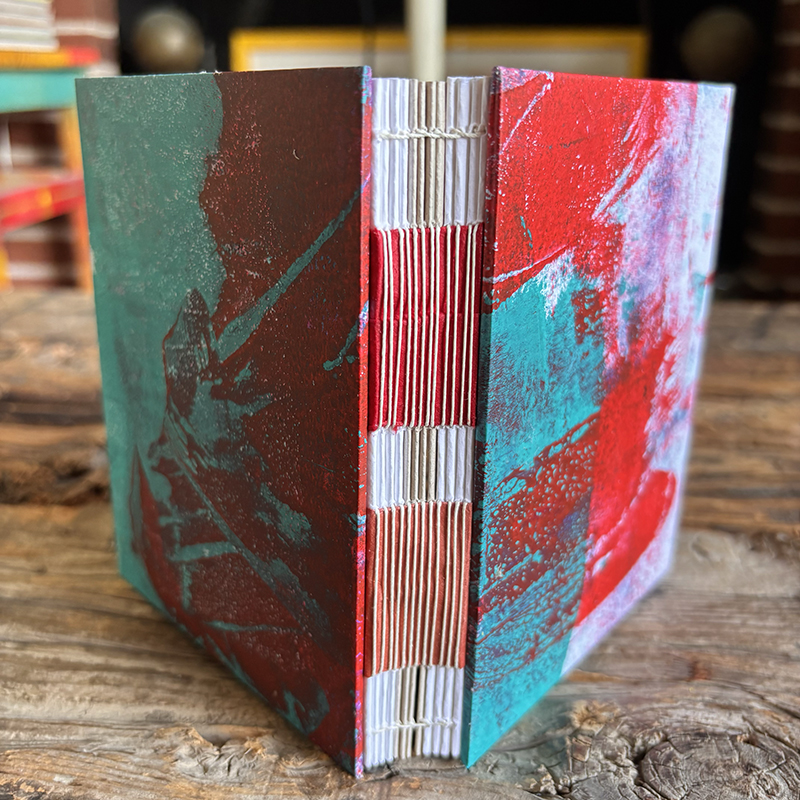 Abstract layered pieces of painted papers are cut and then made into covers for this square hand sewn journal. Most of the prints from this season’s collection were drawn & printed using Gelli plates and printed either straight to the book board or on 60-80 lb. Kraft or Drawing paper.