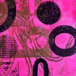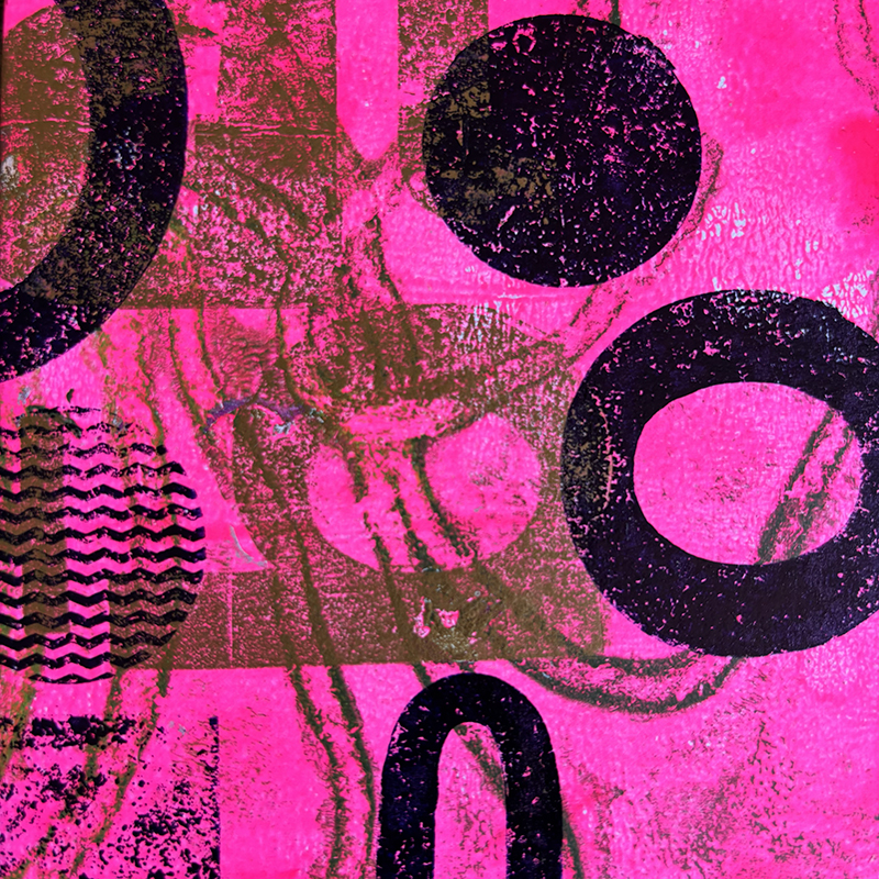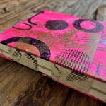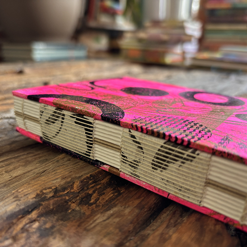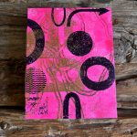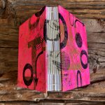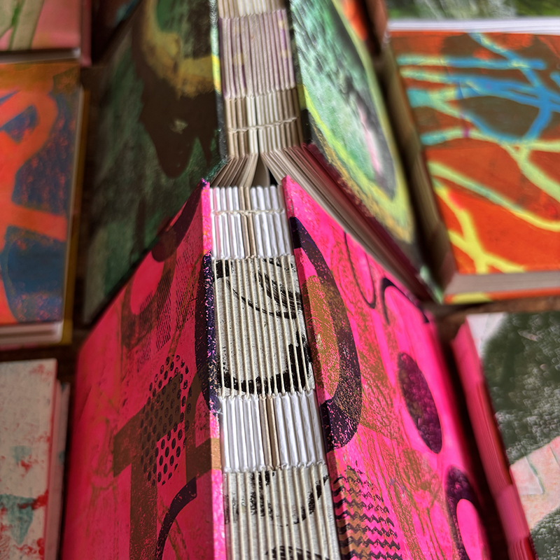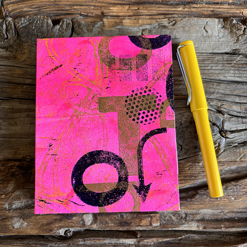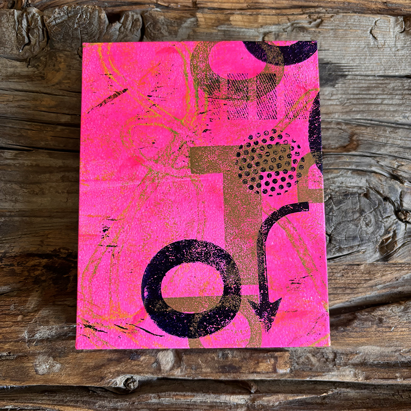 Abstract layered pieces of painted papers are cut and then made into covers for this square hand sewn journal. Most of the prints from this season’s collection were drawn & printed using Gelli plates and printed either straight to the book board or on 60-80 lb. Kraft or Drawing paper.