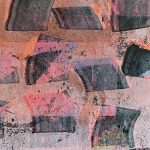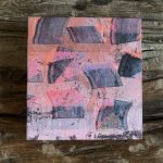 Abstract layered pieces of painted papers are cut and then made into covers for this square hand sewn journal. Most of the prints from this season’s collection were drawn & printed using Gelli plates and printed either straight to the book board or on 60 lb. Kraft paper.