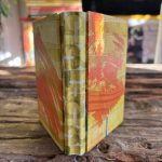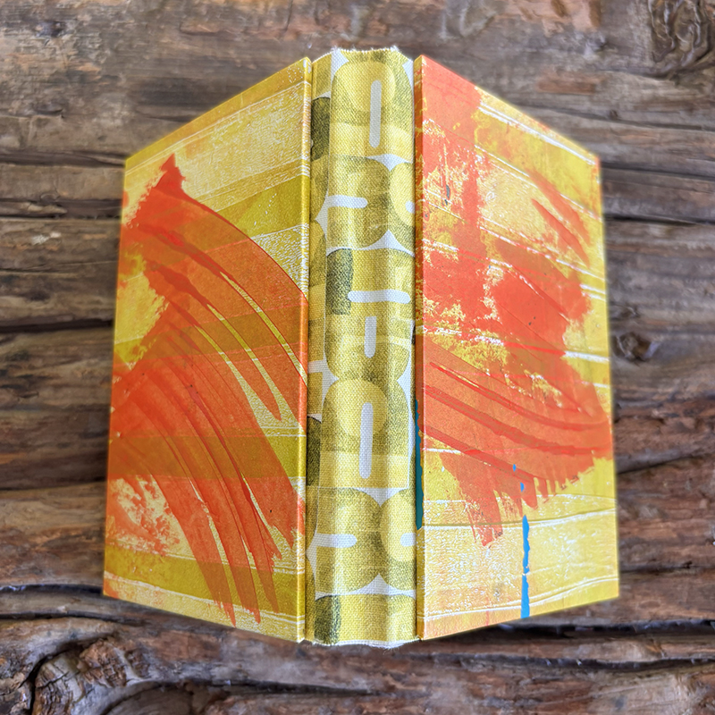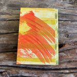 Abstract layered pieces of painted papers are cut and then made into covers for this square hand sewn journal. Most of the prints from this season’s collection were drawn & printed using Gelli plates and printed either straight to the book board or on 60-80 lb. Kraft or Drawing paper.