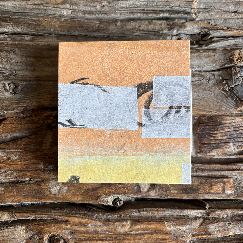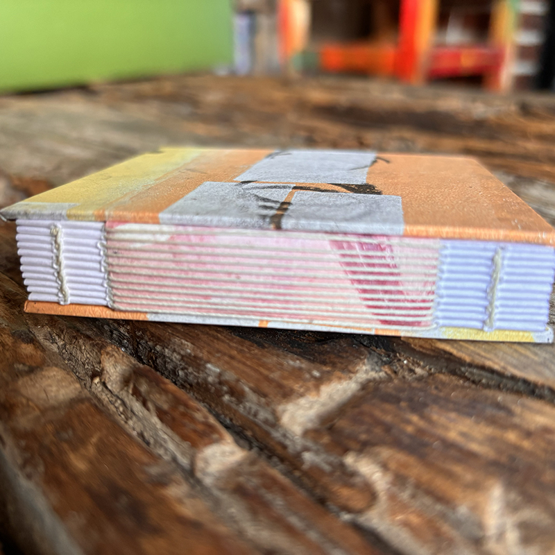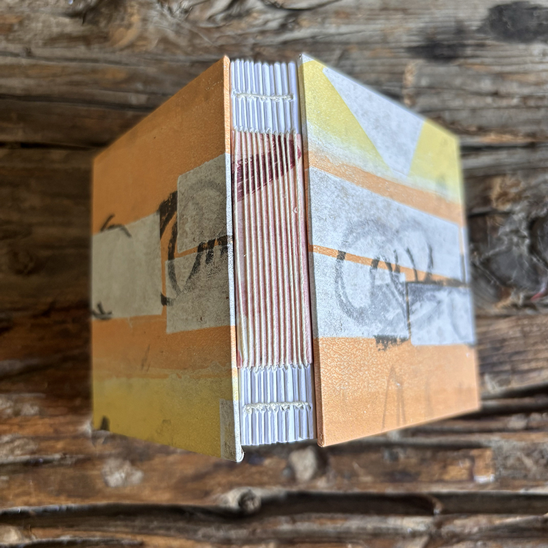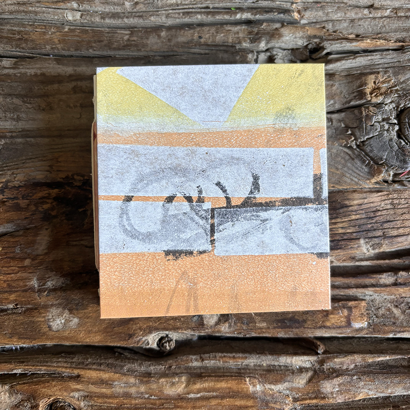 Abstract layered pieces of painted papers are cut and then made into covers for this square hand sewn journal. Most of the prints from this season’s collection were drawn & printed using Gelli plates and printed either straight to the book board or on 60-80 lb. Kraft or Drawing paper.