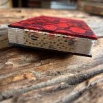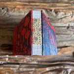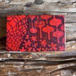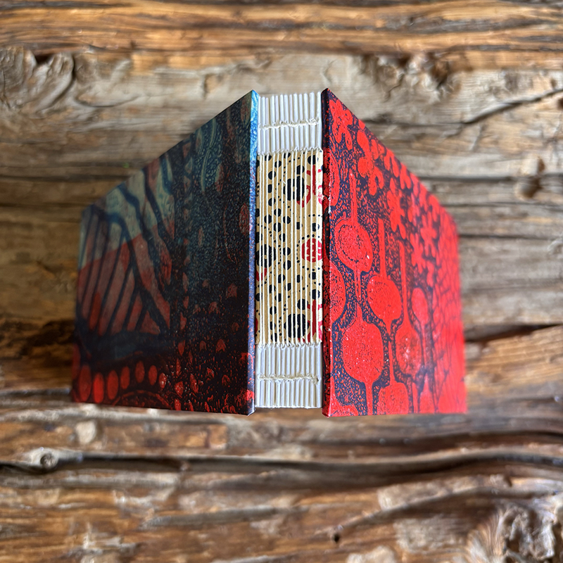 Abstract layered pieces of painted papers are cut and then made into covers for this square hand sewn journal. Most of the prints from this season’s collection were drawn & printed using Gelli plates and printed either straight to the book board or on 60-80 lb. Kraft or Drawing paper.