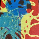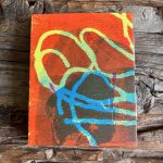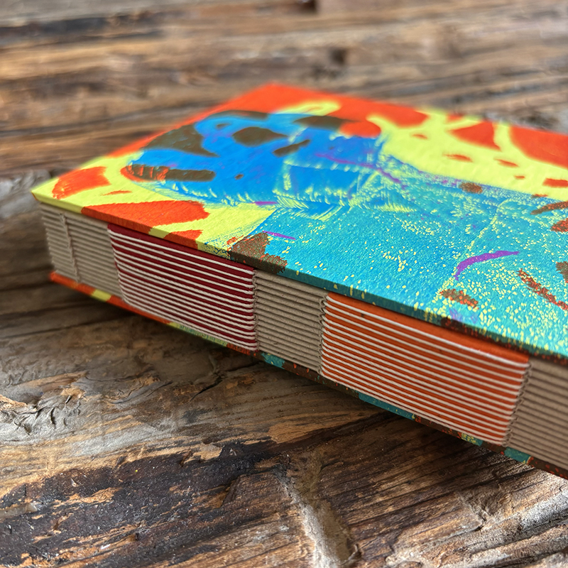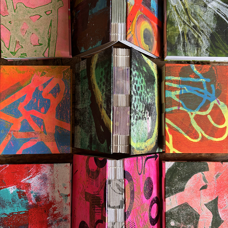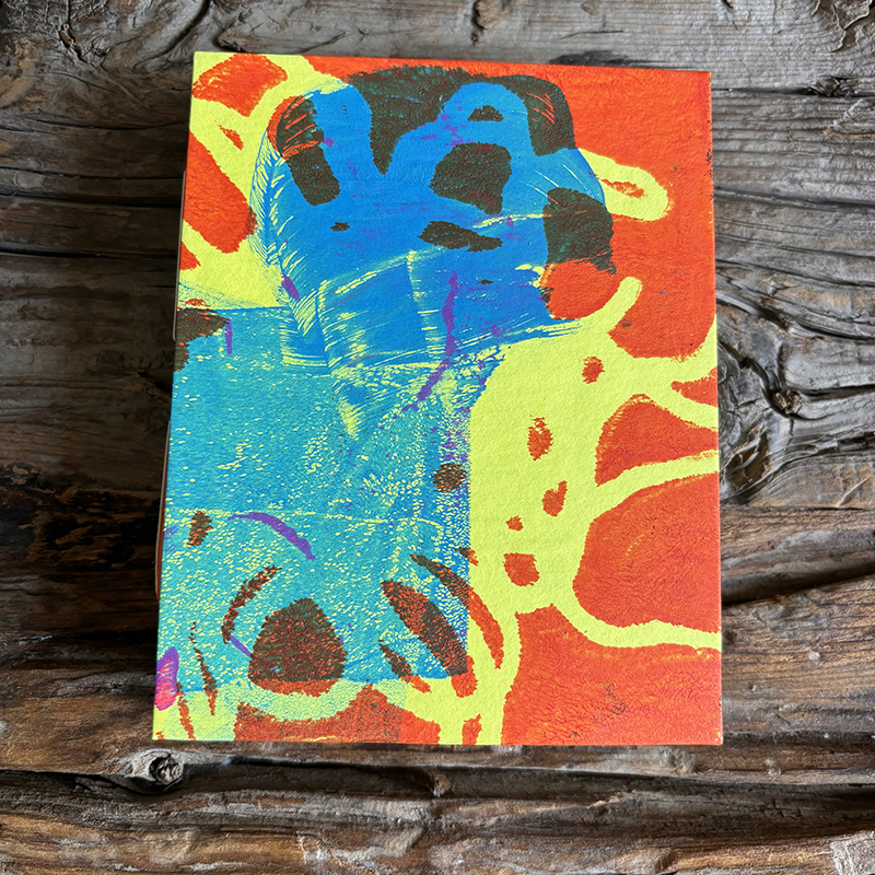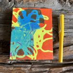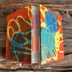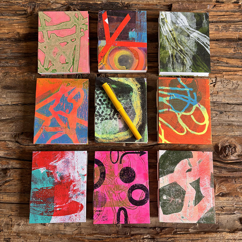 Abstract layered pieces of painted papers are cut and then made into covers for this square hand sewn journal. Most of the prints from this season’s collection were drawn & printed using Gelli plates and printed either straight to the book board or on 60-80 lb. Kraft or Drawing paper.