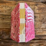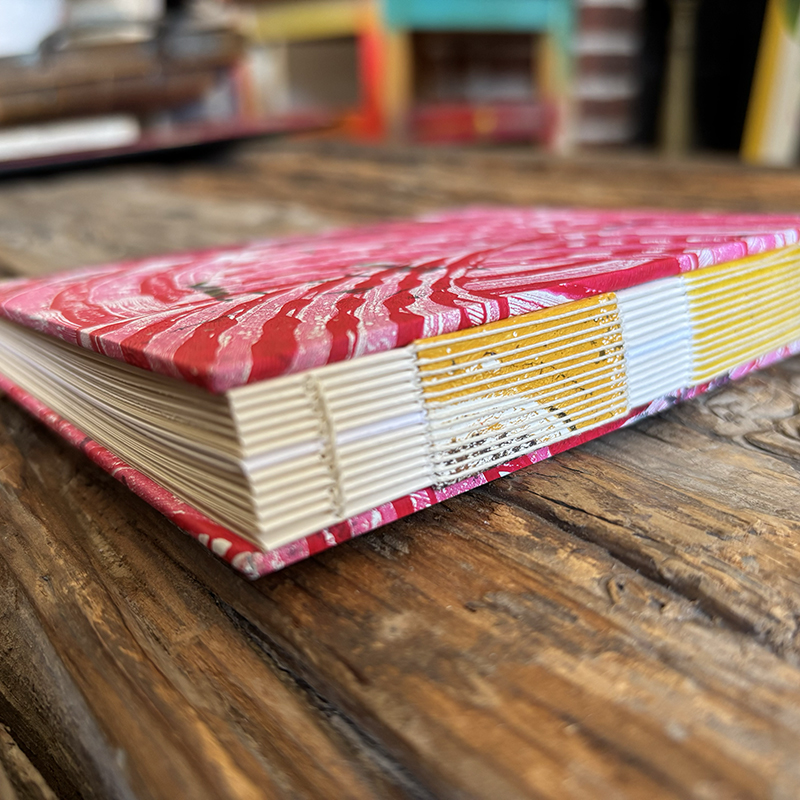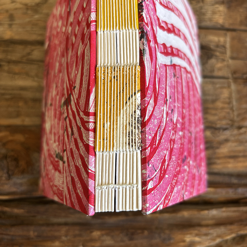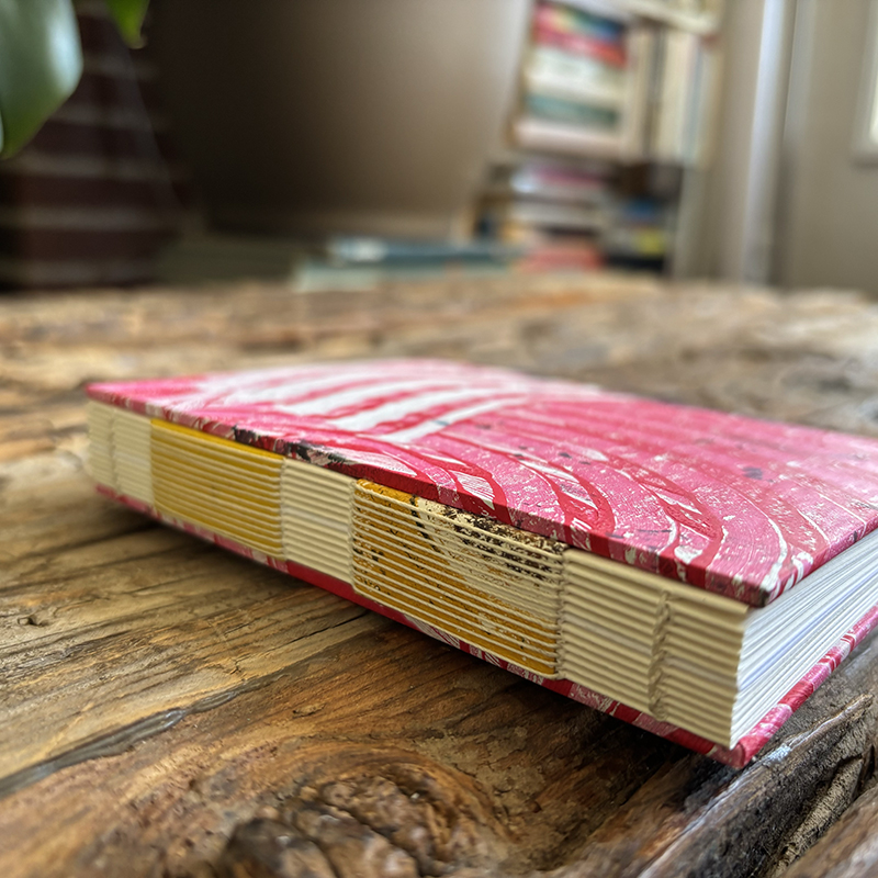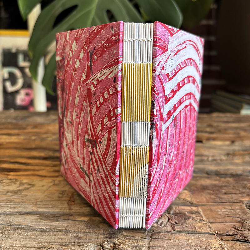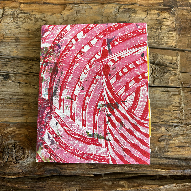 Abstract layered pieces of painted papers are cut and then made into covers for this notebook. These covers were made using acrylic mono prints (made on Gelli plates).