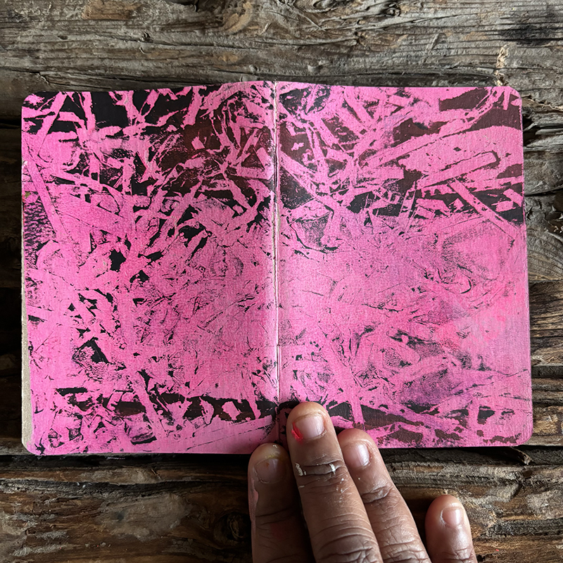 In between projects I just started mono printing on the covers and weeks later—little by little—all 50 are covered. Now, I have no need for 50 small gridded notebooks, hence their arrival to the site.
