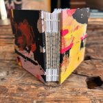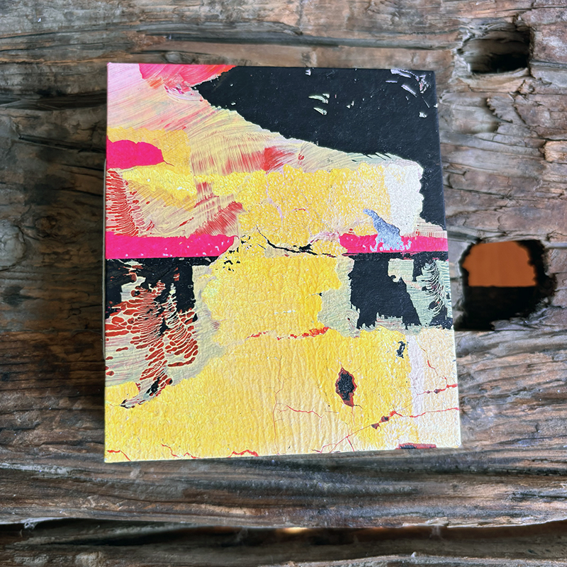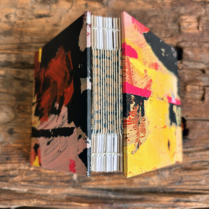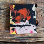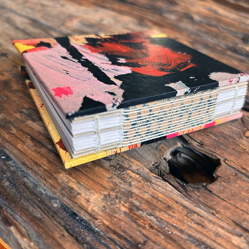 Abstract layered pieces of painted papers are cut and then made into covers for this square hand sewn journal. Most of the prints from this season’s collection were drawn & printed using Gelli plates and printed either straight to the book board or on 60-80 lb. Kraft or Drawing paper.